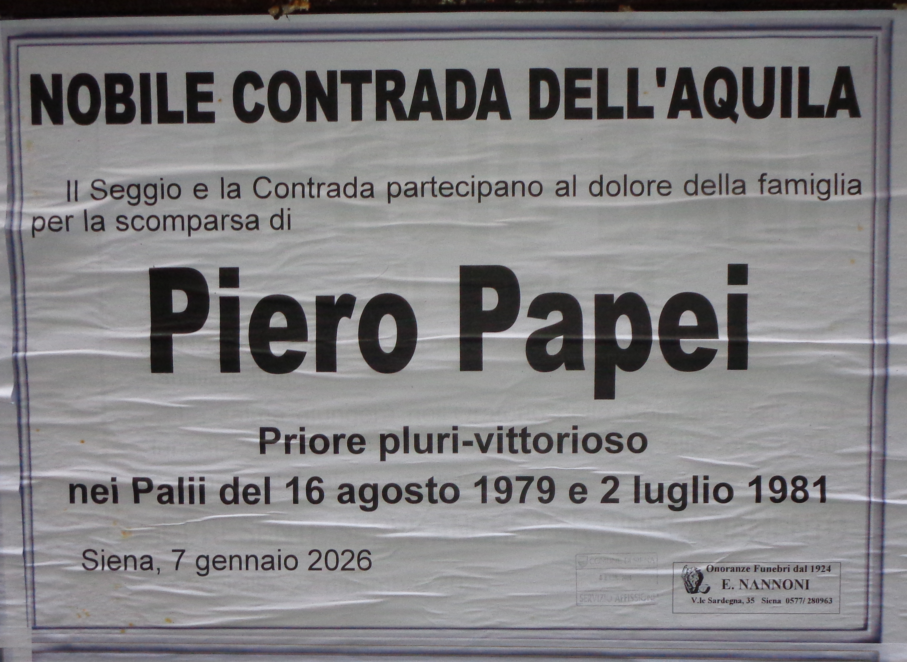 seconda generazione di Bruno e Frati Iris Nato a Siena (S.Giovanni Battista) il 15 giugno 1928 (per vedere i testimoni (Giuseppe e Bianca Papei) Morto a Siena (Ospedale - Pronto Soccorso) il 4 gennaio 2026 1° matrimonio a Siena (S.Domenico) con Casini Elsa il 6 aprile 1953 2° matrimonio a Cavo (LI) con Amerighi Graziella ved. Battigalli il 7 ottobre 1995 pagina successiva