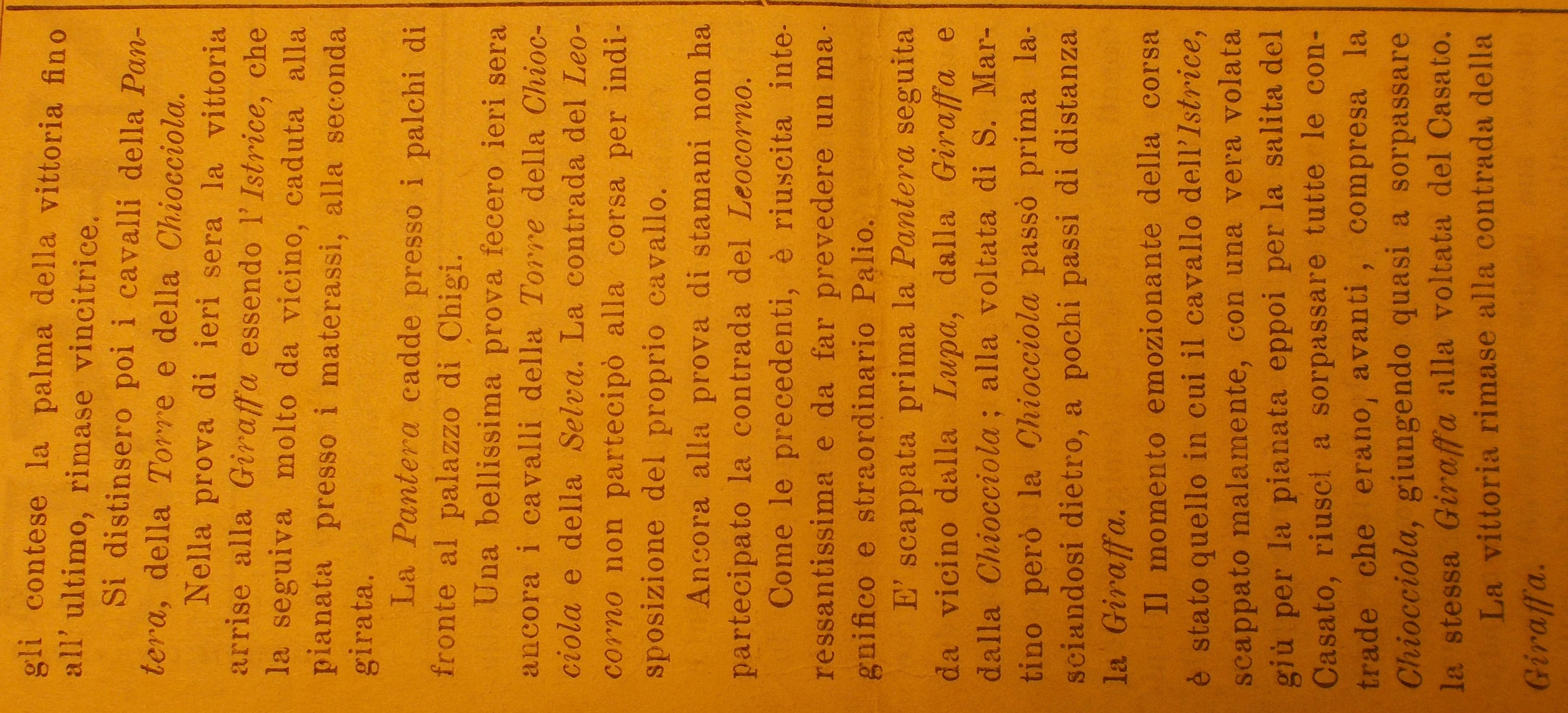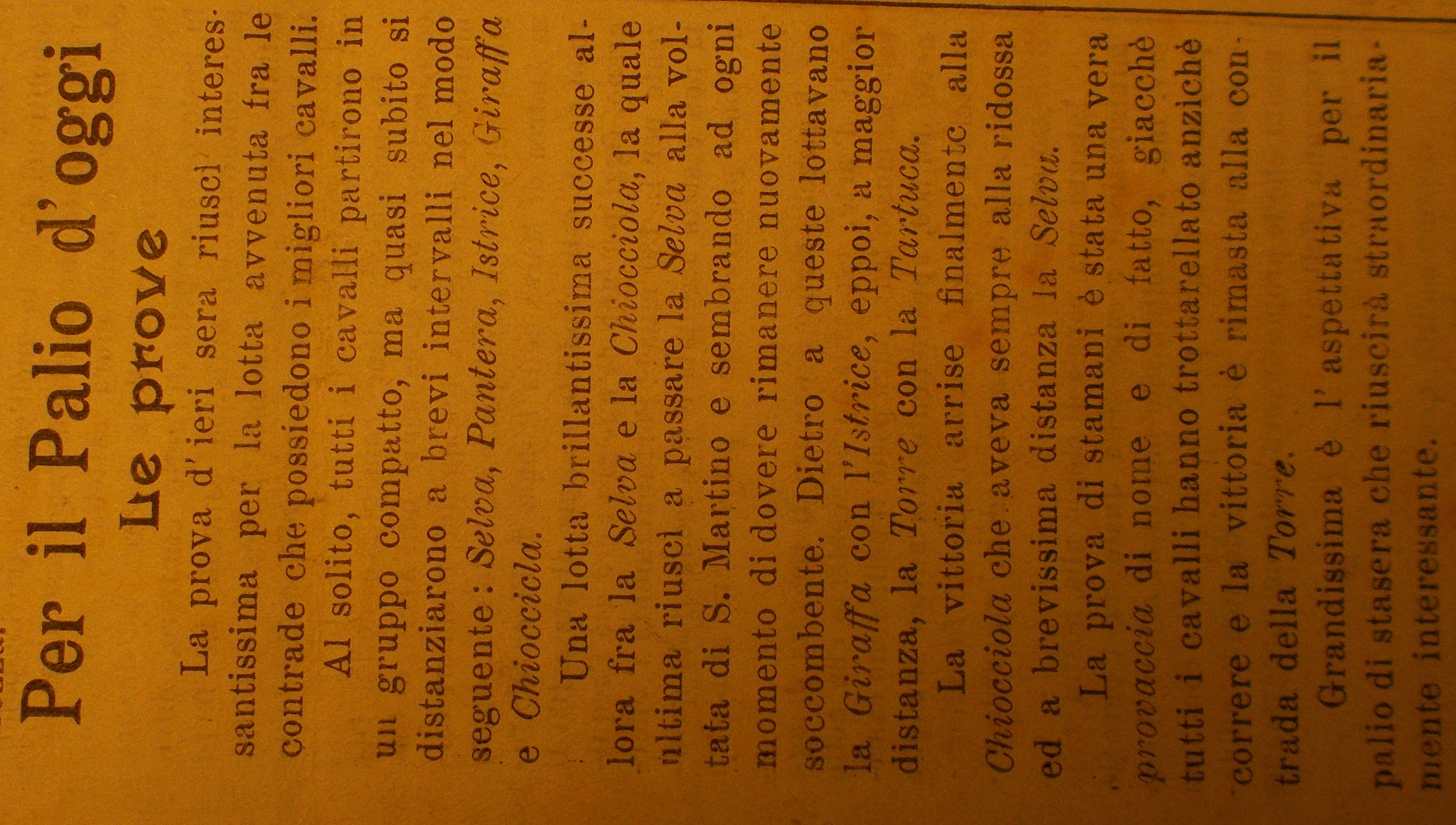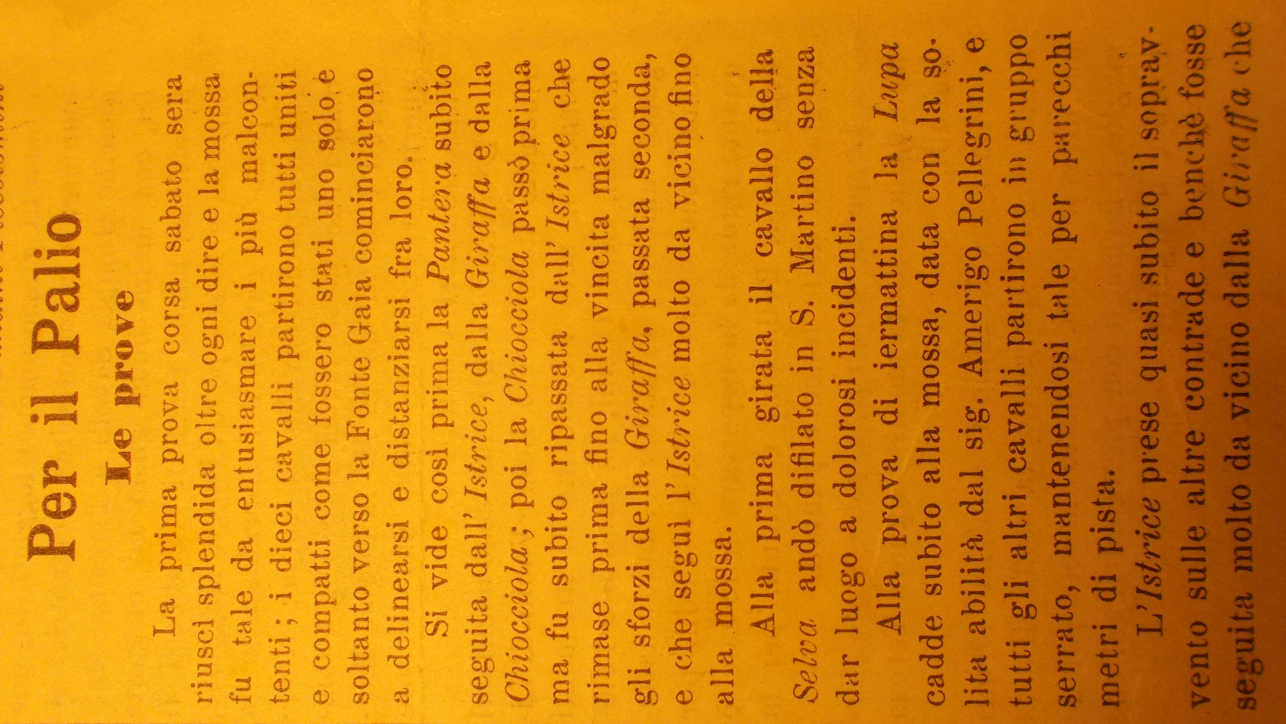 In neretto chi vinse la prova; l'ordine delle dieci Contrade segue quello dell'estrazione, ossia รจ riferito alla prima prova. Il Palio fu vinto dalla Selva (vedi la scheda relativa) La Vedetta Senese, 15 agosto 1904 La Vedetta Senese, 16 agosto 1904