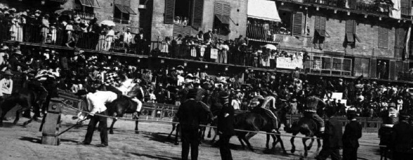 Qui entra in gioco quindi il nostro “eterno quesito”. Quando la decima inizia a rimanere fuori ed essere arbitro, insieme al mossiere, del tempo di mossa? Tra gli anni ’20 ed i ’30, come sottolinea Profeti, probabilmente cambia l’interpretazione della dinamica della rincorsa, ma da qui ad affermare che la rincorsa nasce alla fine del primo ventennio del secolo vi è una profonda differenza, anche perché come vedremo, esistono documenti fotografici e non solo, che attestano chiaramente il fatto che già ad inizio ’900 la decima rimaneva fuori e partiva da dietro. Probabilmente entrava a passo, o mezzo trotto, ed una volta vicino al canape il mossiere abbassava ? (e per questo allora prenderebbe senso la protesta del Bruco del ’32 o la squalifica a Picino del ’28) Probabilmente era il mossiere a chiamarla ( e qui torna il quesito) quando sentiva che la mossa era matura? Non possiamo rispondere con esattezza a tali quesiti, ma cerchiamo sostegno in ciò che abbiamo al fine di mettere in chiaro il fatto che a nostro avviso, la rincorsa nel Palio di Siena, nasce e si consolida tra la fine del 1800 e l’inizio del 1900. Come?, Andiamo a vedere.