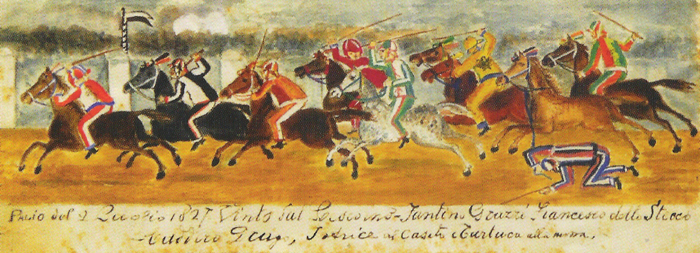 Un’altra riproduzione, probabilmente basata sulla tradizione orale, ricca di imprecisioni. Partì primo l’Istrice che però cadde al primo San Martino per l’ostacolo di uno spettatore, tale Mannajone macellaro. Stessa sorte per la Tartuca, ostacolata dal Drago. Presero la testa Oca e Valdimontone, tallonate dalla Lupa e dal Leocorno che in volata ebbe la meglio sulle rivali grazie a Francesco Grazzi detto “Stecco”. Nel dipinto sono raffigurate otto contrade tra cui l’Aquila che non corse, ritratta la posto della Giraffa. Non compaiono la Tartuca, che come detto cadde ed il Drago. Errori anche nella didascalia, dove viene citata la caduta del Drago, mai avvenuta, oltre ad essere sbagliati pure i luoghi delle cadute della Tartuca e dell’Istrice.