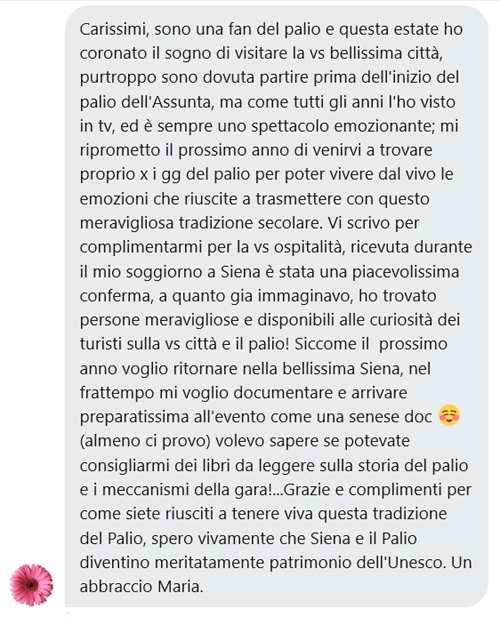Buongiorno a tutti, mi chiamo Halima e desideravo sapere se potete darmi qualche dritta o consiglio sull'acquisto/adozione dei cavalli che corrono il palio. A chi posso rivolgermi? Io sono addestratrice e ex ostacolista allieva del Colonnello Paolo Angioni a sua volta allievo dei fratelli D' Inzeo. Stiamo lavorando con la mia associazione a un progetto rivolto alle detenute della Casa Circondariale di Rebibbia qui a Roma, nello specifico la creazione di un piccolo centro equestre e pensione cavalli interamente gestito dalle detenute. Non so che fine fanno i cavalli del Palio ma so per certo che potrebbero avere una seconda possibilità . Noi vorremmo evitare, per principio, di spendere cifre folli e assurde e ci chiedevamo se esistesse la possibilità di prendere in custodia i cavalli del Palio. Sareste dirmi a chi potrei rivolgermi? Grazie mille