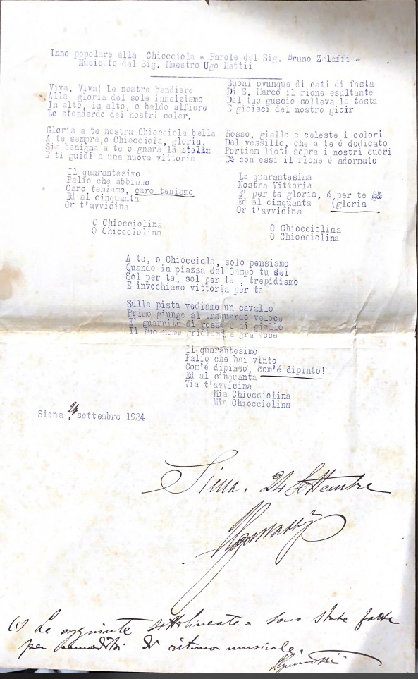 È qui che dai documenti salta fuori un terzo protagonista: il maestro cav. Ugo Mattii, direttore della Banda ed autore di uno “squillo” delle chiarine di palazzo che ancora è nel repertorio. Sono sue molte delle trascrizioni conservate ancora oggi nell’archivio della Banda Città del Palio. Mattii collabora col maestro Bonnoli in modo che il programma musicale della serata venga condiviso fra le due bande ed opera una trascrizione dell’inno che è ancora conservata nell’archivio di contrada, insieme agli spartiti. Scritta a penna c’è la dedica “alla nobil contrada della Chiocciola” e la data 24 settembre 1924. Sopra al testo di Bruno Zalaffi si legge l’appunto: “le aggiunte sottolineate sono state fatte per comodità di ritmo musicale”. Ci si riferisce ad alcune ripetizioni nel testo, ma soprattutto vengono inseriti gli squilli iniziali della Marcia del Palio, a segnare un legame originario con quello che era diventato il vero e proprio inno del Palio e della città.