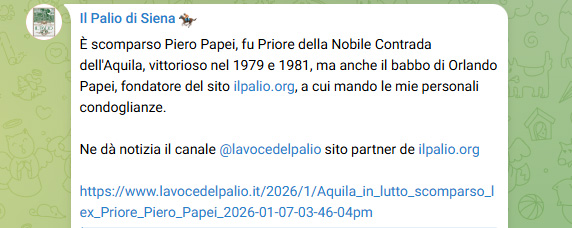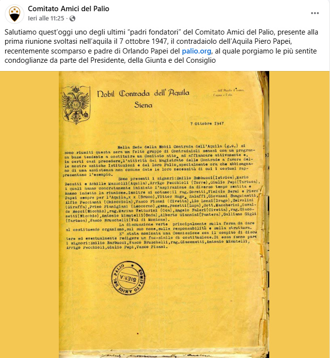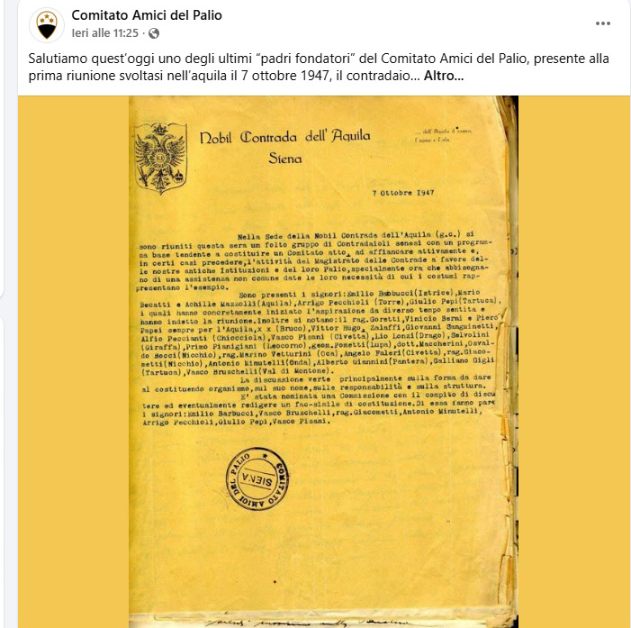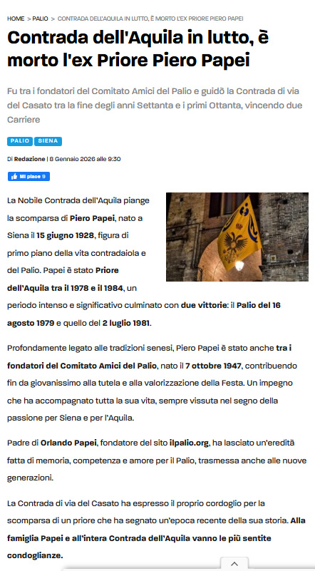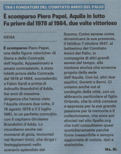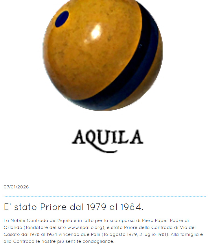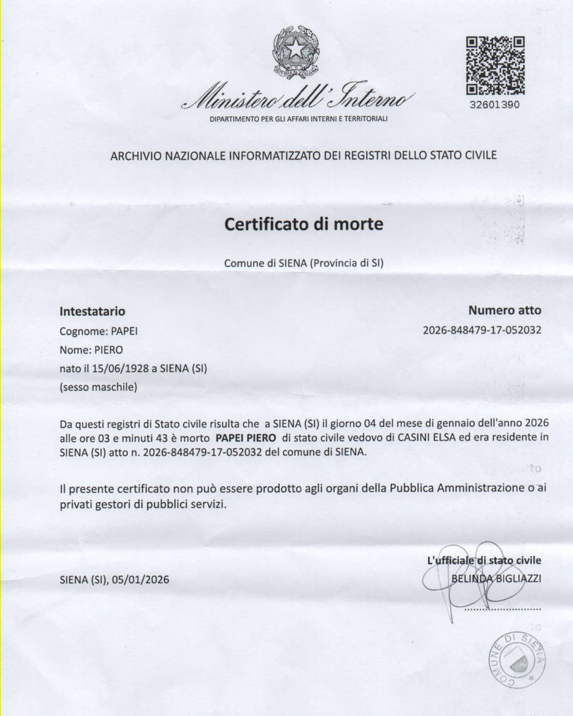 seconda generazione di Bruno e Frati Iris Nato a Siena (S.Giovanni Battista) il 15 giugno 1928 (per vedere i testimoni (Giuseppe e Bianca Papei) Morto a Siena (Ospedale - Pronto Soccorso) il 4 gennaio 2026 1° matrimonio a Siena (S.Domenico) con Casini Elsa il 6 aprile 1953 2° matrimonio a Cavo (LI) con Amerighi Graziella ved. Battigalli il 7 ottobre 1995 pagina successiva