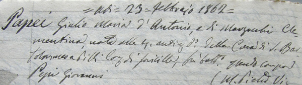 quarta generazione di Antonio e Marzocchi Clementina Nato a S.Rocco a Pilli il 23 febbraio 1862 Morto in S.Maurizio in S.Spirito di nefrite a Siena il 21 agosto 1910 Altezza m. 1,60, capelli castani lisci, occhi celesti, sa leggere e scrivere riformato il 6 ottobre 1884 per debole costituzione 1° matrimonio a Barontoli con Masi Sestilia il 15 febbraio 1885 dalla quale ebbe Pietro e Augusto 2° matrimonio a Serravalle con Savelli Annunziata il 28 ottobre 1893 dalla quale ebbe, oltre a Bruno, anche Bianca, Giuseppe e Bruna pagina successiva