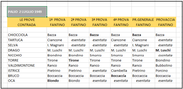 In neretto chi vinse la prova; l'ordine delle dieci Contrade segue quello dell'estrazione, ossia รจ riferito alla prima prova. Il Palio fu vinto dalla Chiocciola (vedi la scheda relativa) provaccia